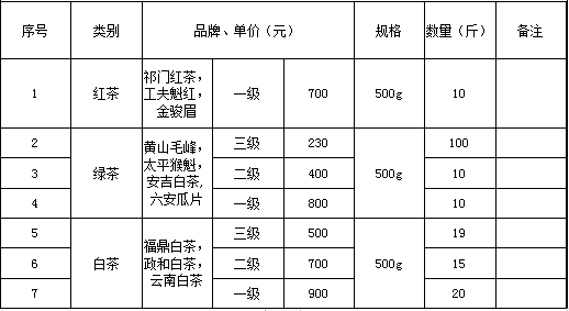 本項目是淮北市建投控股集團有限公司2021年度茶葉采購項目,具體如下:![]() 注;1、二級三級茶葉采用盒裝或罐裝包裝,一級采用禮品裝包裝(以采購方實際需求為準)。 2、重量為除去包裝后茶葉凈重要求。 3、本次茶葉采購具體數(shù)量可能略有變化,按照實際采購數(shù)量確定。 |