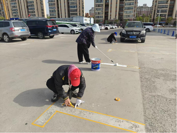 活動現(xiàn)場,黨員們手持專業(yè)工具,對體育場內(nèi)的車位線進行覆描。大家分工明確,有的負責測量車位尺寸,有的負責涂刷標線,還有的負責現(xiàn)場秩序維護,確保覆描工作有序進行。