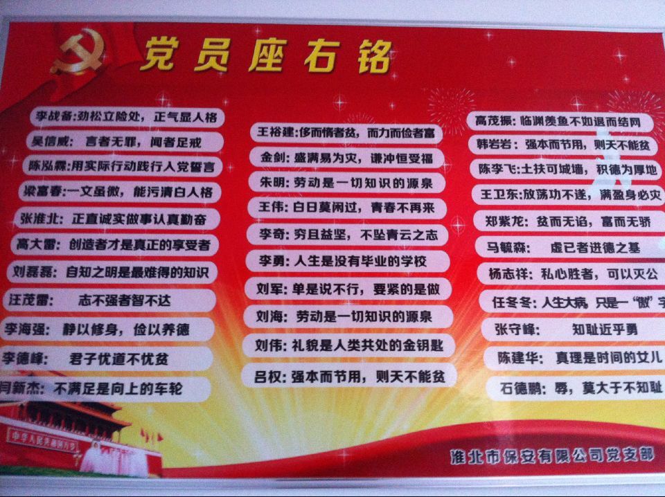 為了進(jìn)一步組織和動員廣大黨員更好地為群眾辦實事、做好事、解難事,淮北市保安公司黨支部結(jié)合“兩學(xué)一做”活動,在全體黨員中開展“座右銘展示”活動,要求每個在職黨員以座右銘鞭策自己的行動,轉(zhuǎn)變工作作風(fēng),進(jìn)一步塑造黨員的良好形象。